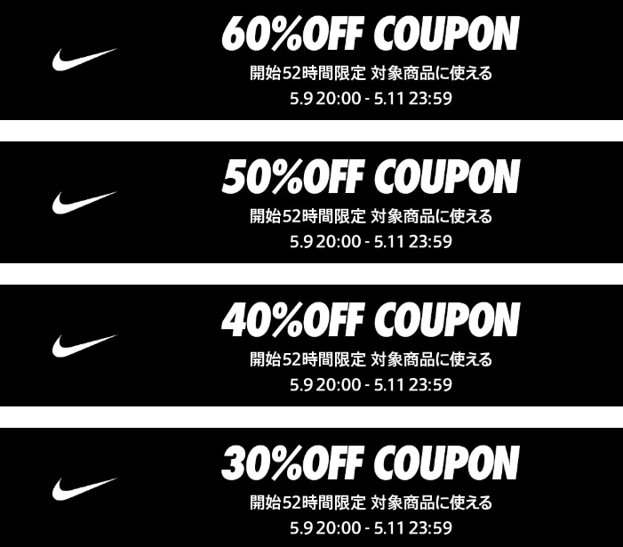 NIKE楽天市場で9日20時から30%OFF〜60%OFFクーポンが出ますよ!20時開始なので今のうちに対象品をチェックしておきましょう!■60%OFFクーポン