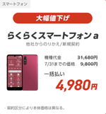 らくらくスマートフォンaがY!mobileへMNPでも新規契約でも一括4,980円送料無料ナリ!事務手数料無料!8/20以降は事務手数料が有料(3,850円)になりますのでそれまでに手続きするのがオススメ!月額プランはシンプル2 のS・M・Lどれを選んでもOK!!FCNT製(富士通)スマホです。実家の父母祖父母のスマホやガラケーが調子悪い!という方はお見逃し無く!レンタル案件ではありませんので、返却不要です。防塵防水おサイフケータイ内蔵。カメラは手ブレ補正あり。5G対応です。詳細は下記公式Y!mobileサイトで!■関連:ZTE製 かんたんスマホ4 一括1円!