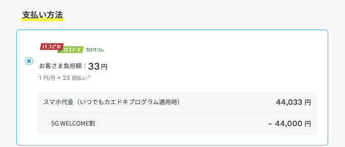 アハモへMNPするとApple iPhone 16 128GBが月額1円x23回払いでレンタル可能!返却を忘れない方には良さそうですね!オンラインなので事務手数料無料!店に行かなくても契約出来ちゃうのはナイスですね!アハモのサイトでiPhone 16のページへ移動したら128GBを選択し、他社からの乗り換え(MNP)を選択すれば、いつでもカエドキプログラムの所が「お客さま負担額:33円」表示になります。■詳細: